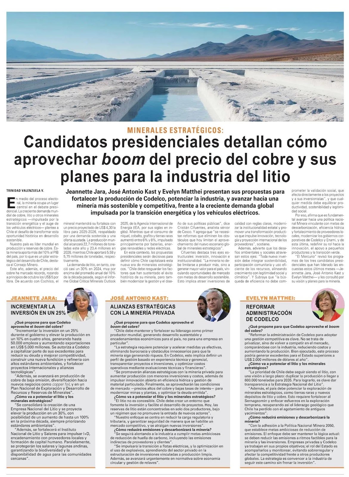 “El Mercurio” revisó los programas de los tres candidatos presidenciales que han liderado las encuestas estos últimos meses —Jeannette Jara, José Antonio Kast y Evelyn Matthei— y les consultó por su visión y planes para la minería.