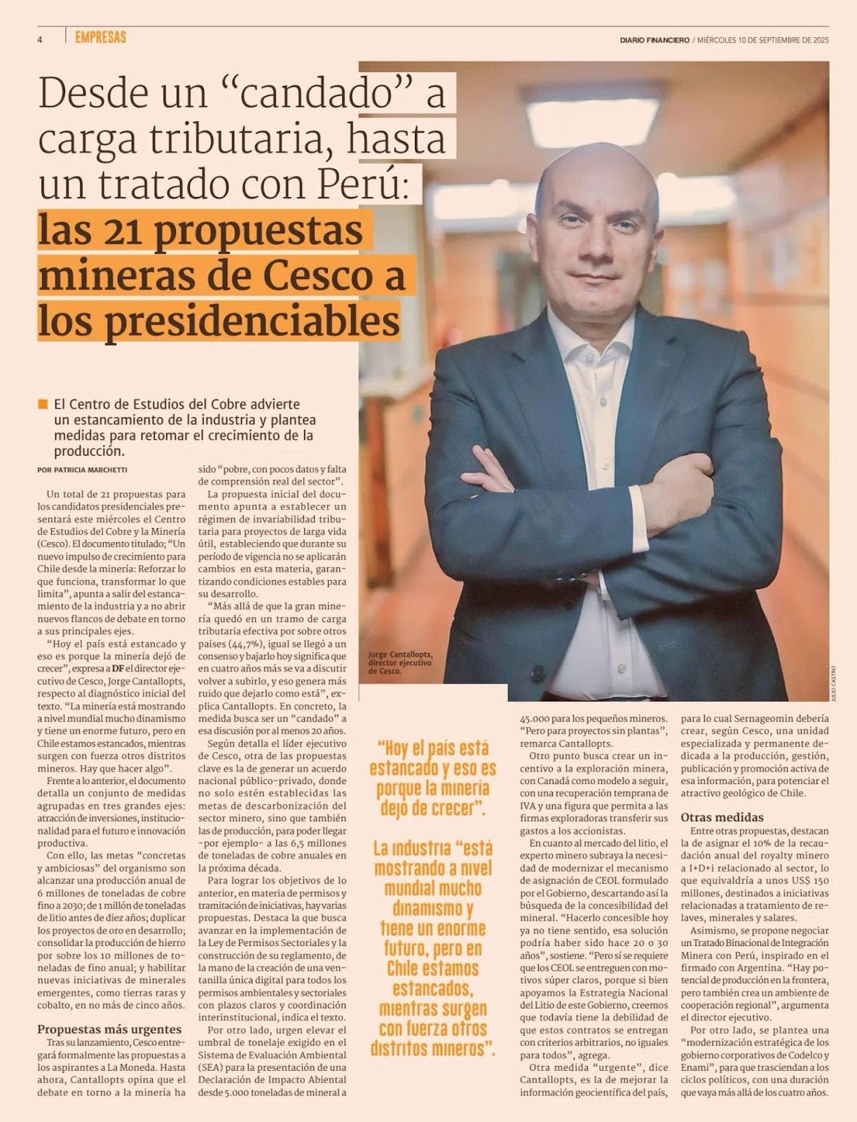 Tras su lanzamiento, Cesco entregará formalmente las propuestas a los aspirantes a La Moneda. Hasta ahora, Cantallopts opina que el debate en torno a la minería ha sido “pobre, con pocos datos y falta de comprensión real del sector”.