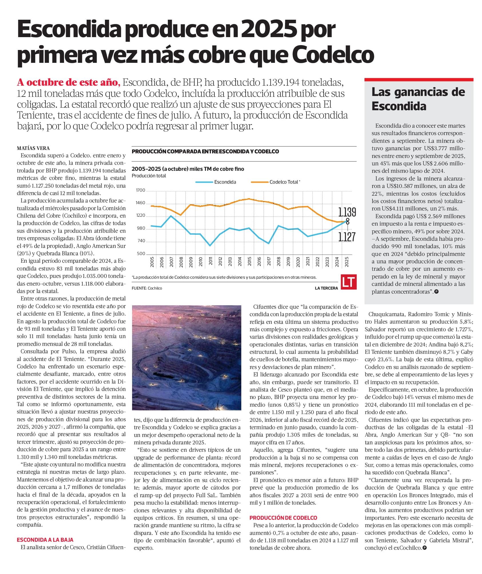 Consultada por Pulso, la empresa aludió al accidente de El Teniente. “Durante 2025, Codelco ha enfrentado un escenario especialmente desafiante, marcado, entre otros factores, por el accidente ocurrido en la División El Teniente, que implicó la detención preventiva de distintos sectores de la mina. Tal como se informó oportunamente, esta situación llevó a ajustar nuestras proyecciones de producción divisional para los años 2025, 2026 y 2027″, afirmó la compañía, que recordó que al presentar sus resultados al tercer trimestre, ajustó su proyección de producción de cobre para 2025 a un rango entre 1.310 mil y 1.340 mil toneladas métricras.
