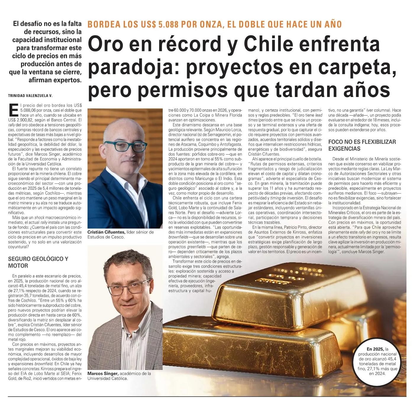 Incorporado en la Estrategia Nacional de Minerales Críticos, el oro es parte de la estrategia de diversificación minera del país. Con precios en máximos, la oportunidad está abierta. “Para que Chile aproveche plenamente este rally del oro y no se limite a un efecto transitorio en ingresos, resulta clave agilizar la inversión en producción minera, actualmente limitada por la ‘permisología’”, concluye Marcos Singer.